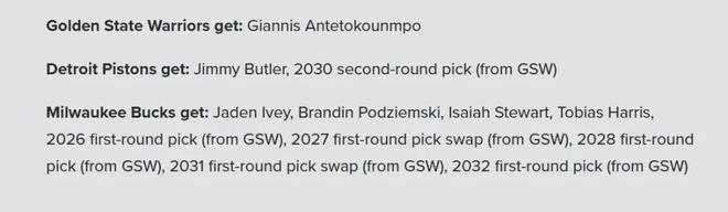 勇士得到字母哥;活塞得到巴特勒+30年次轮签;雄鹿得到艾维+波杰姆斯基+斯图尔特+哈里森+26年首轮签+27年首轮签互换权+28年首轮签+31年首轮签互换权+32年首轮签。